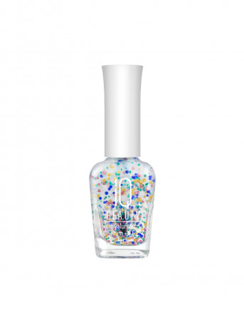 Гиалуроновая кислота создает эффект пленочки, которая защищает кожу от пересушивания, омолаживает и дает ощущение эластичности, а цветные гранулы мгновенно растворяются, доставляют высокую концентрацию витаминов А, Е, С для питания ногтей и кутикулы.